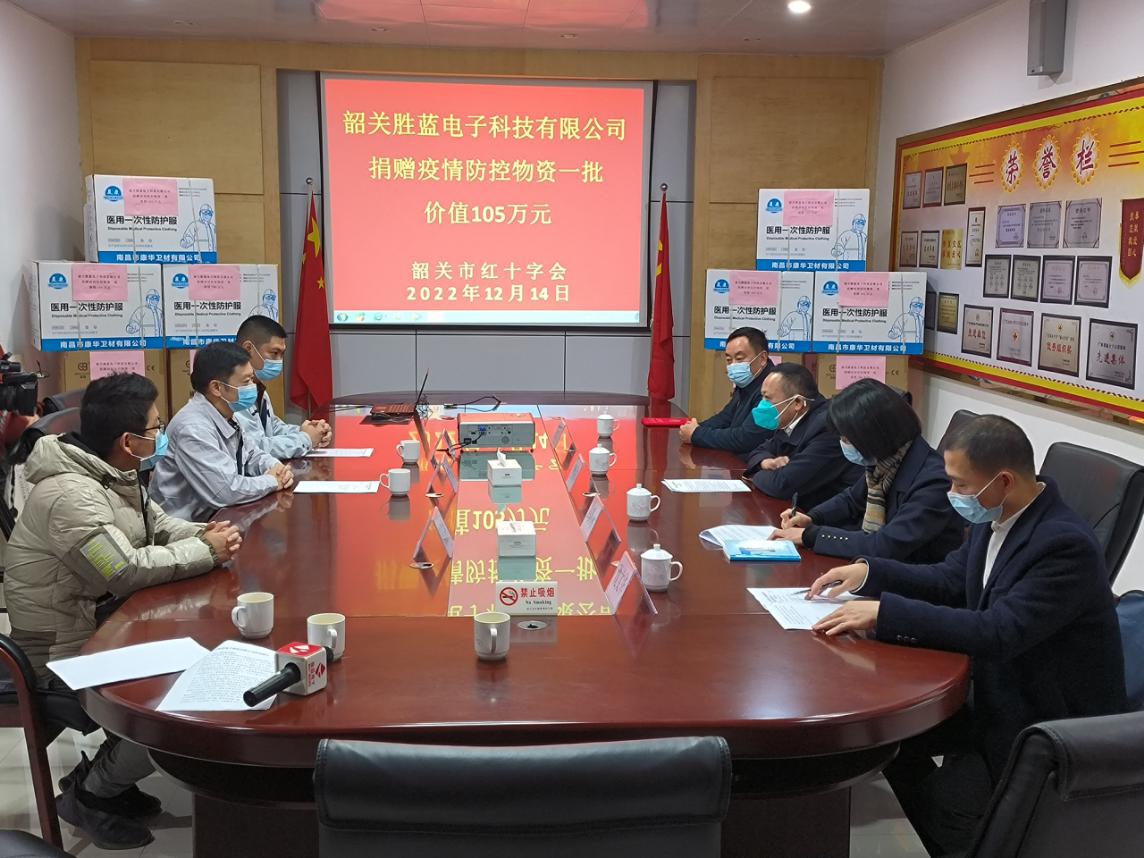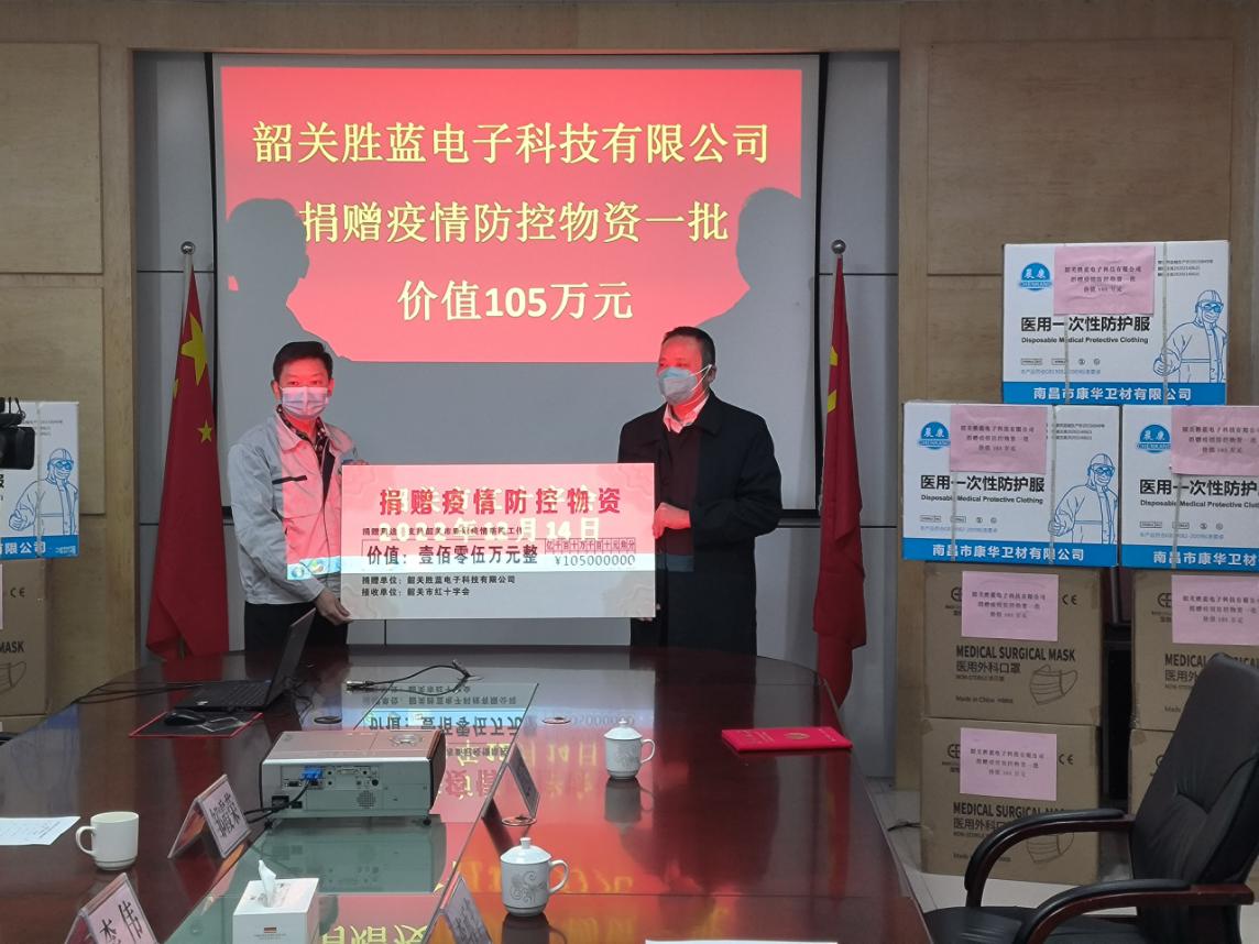 倡议书发出后,韶关胜蓝电子科技有限公司积极响应,彰显爱心企业担当,向市红十字会表达了捐赠意愿。根据我市疫情防控工作需求,胜蓝电子科技有限公司股东陈德爱女士特采购一批价值 105万元疫情防控物资捐赠给我市,包括 50 万个医用外科口罩和2 万套医用防护服。