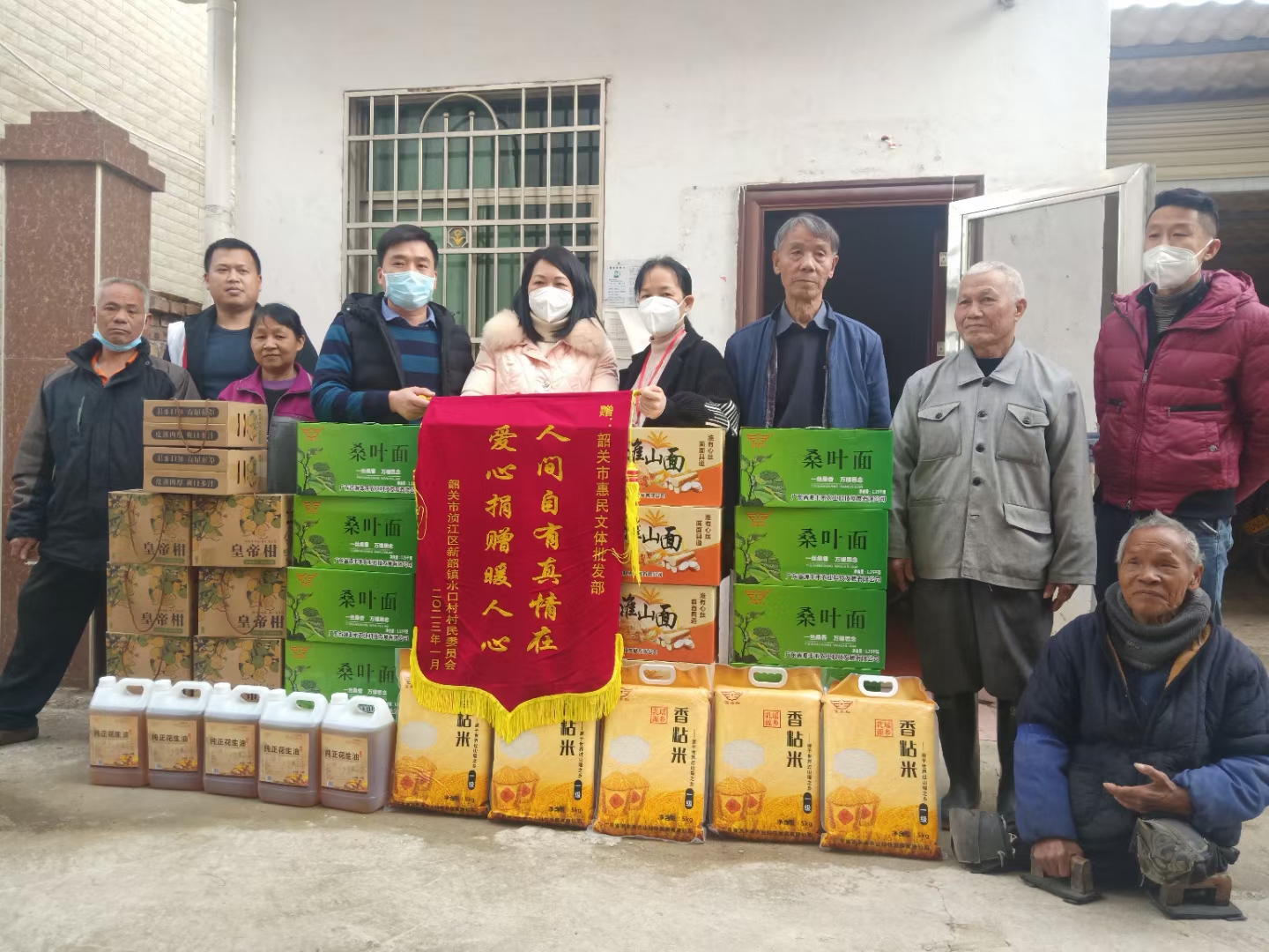 善美韶关,处处绽放爱的温暖。2023年1月10日,阳光明媚,春意盎然,韶关市源丰贸易有限公司、惠民文体批发中心廖招丘董事长与浈江区红十字工作者一行,带着米、面、油和皇帝柑等慰问品一批,来到浈江区新韶镇水口村委慰问困难群众,让群众倍感温暖。