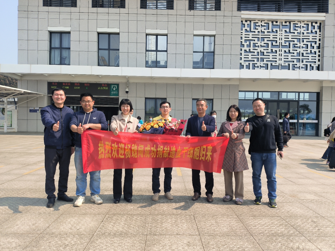 2023年2月23日中午,赴广州成功捐献造血干细胞的志愿者杨魏闻凯旋归来。韶关市红十字会专职副会长冯珍素及红十字会工作人员前往乐昌东高铁站迎接。