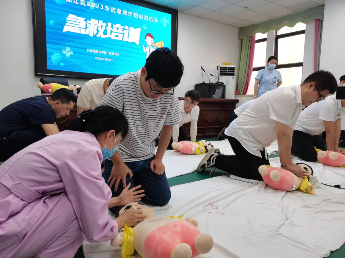 曲江区红十字会以2023年红十字博爱周为契机,于5月8至9日继续推进开展应急救护培训进机关、进企业活动,先后走进共青团曲江区委员会、曲江经济开发区开展普及推广应急救护知识和急救技能培训讲座。区人民医院和韶关市120应急救护指挥中心急救培训师通过理论讲解、示范操作相结合的方式,现场示范了心肺复苏术、海姆立克急救法的操作流程和动作要领,对参训人员心肺复苏术不规范的操作进行纠正,为今后的应急救护志愿服务打下基础。(曲江区红十字会供稿)