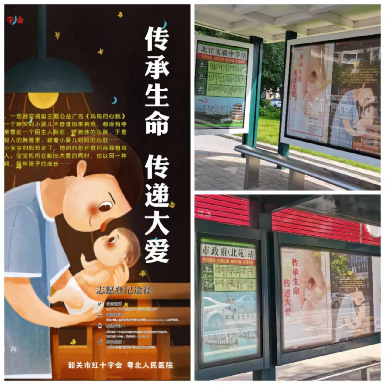 除了现场活动外,韶关市红十字会还联合粤北人民医院在韶关电视台播放央视《妈妈的心跳》器官捐献公益宣传广告,在市区候车亭刊播大型海报,提升市民对器官捐献意义的认识。