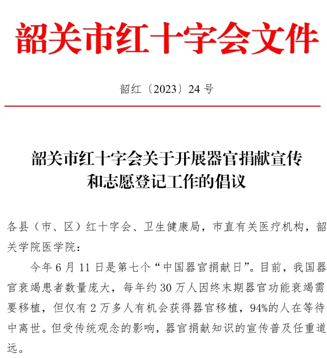 2023年6月11日是第7个“中国器官捐献日”,为保护人的生命和健康,进一步弘扬“人道、博爱、奉献”的红十字精神,韶关市红十字会推出系统活动,积极推动器官捐献宣传和志愿登记工作。