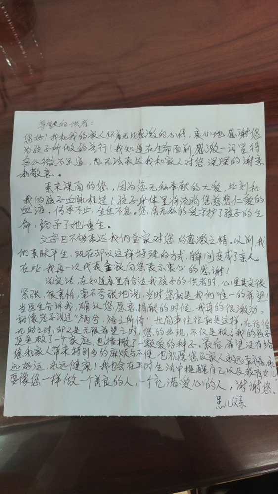 “素未谋面的您,因为您无私奉献的大爱,此刻和我的孩子血脉相连,孩子身体里将流淌您慈悲仁爱的血液,传承不止,生生不息。您用无私的爱守护了孩子的生命,给予了她重生。”2023年7月10日,韶关学院医学院大三学生林幸在南方医科大学珠江医院捐献造血干细胞混悬液,为一名血液病重症少女带去生的希望。林幸是全国第15596例、广东省第1666例、韶关市第30例成功捐献造血干细胞志愿者。患儿父亲情真意切的感谢信,表达了他们一家对林幸同学深深的感激之情。