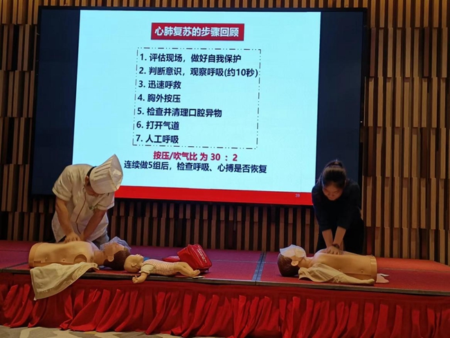 (员工现场学习心肺复苏操作)