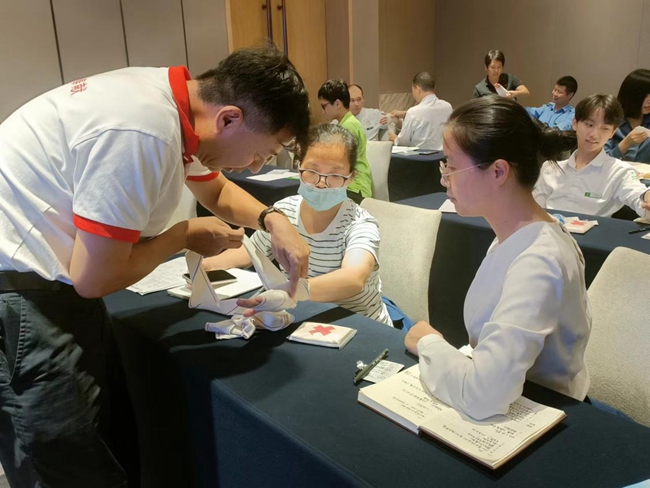 培训课上,市红十字会资深老师李恒、陈建重点围绕红十字运动来源、救护概论、心肺复苏、自动体外除颤器(AED)、气道异物梗阻、创伤救护概述、创伤救护技术开展了详细的讲解。并借助模拟人、AED和绷带进行现场示范,要求员工重点掌握心肺复苏流程、按压点、按压频率和次数、人工呼吸正确方式等,重点掌握AED操作流程和电机片的贴法,借助“石头、剪刀、布”的口诀重点掌握海姆立克法操作要点,重点掌握创伤救护的四项技术:止血、包扎、固定、搬运,学会绷带的环形、螺旋、“8”字包扎法,三角巾的头顶帽式、单肩胸部包扎法等。