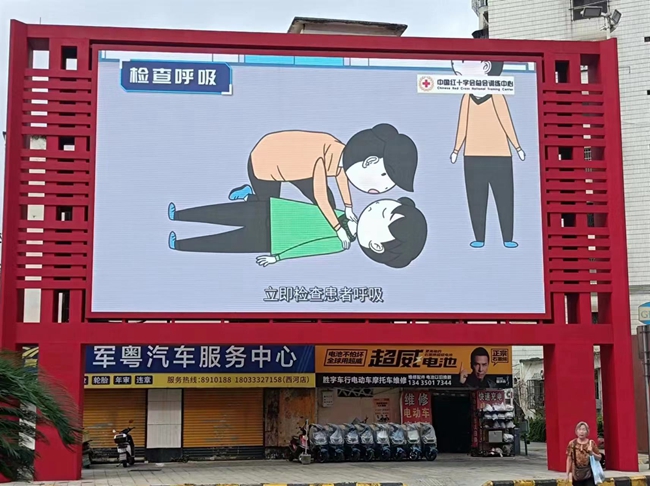此外,市红十字会和武江区红十字会还分别在武江区工业西路大转盘和摩尔城商城的大屏幕,轮番播放应急救护培训视频,让群众进一步了解应急救护知识。
